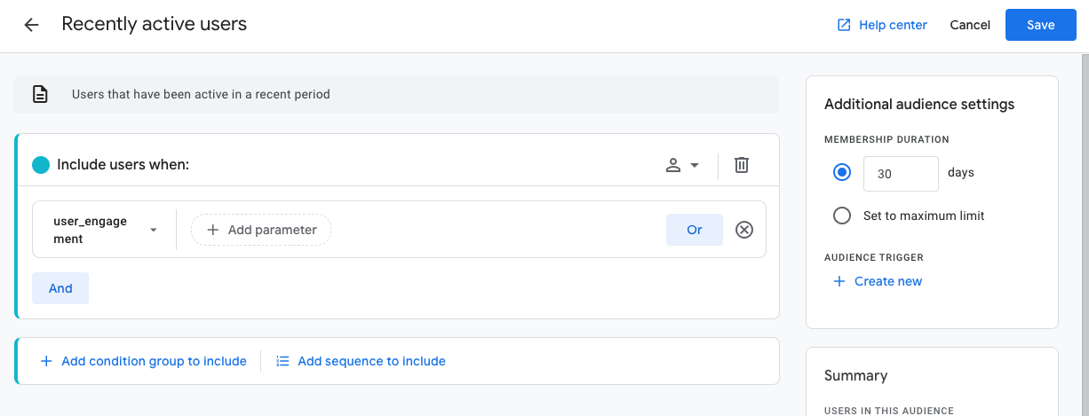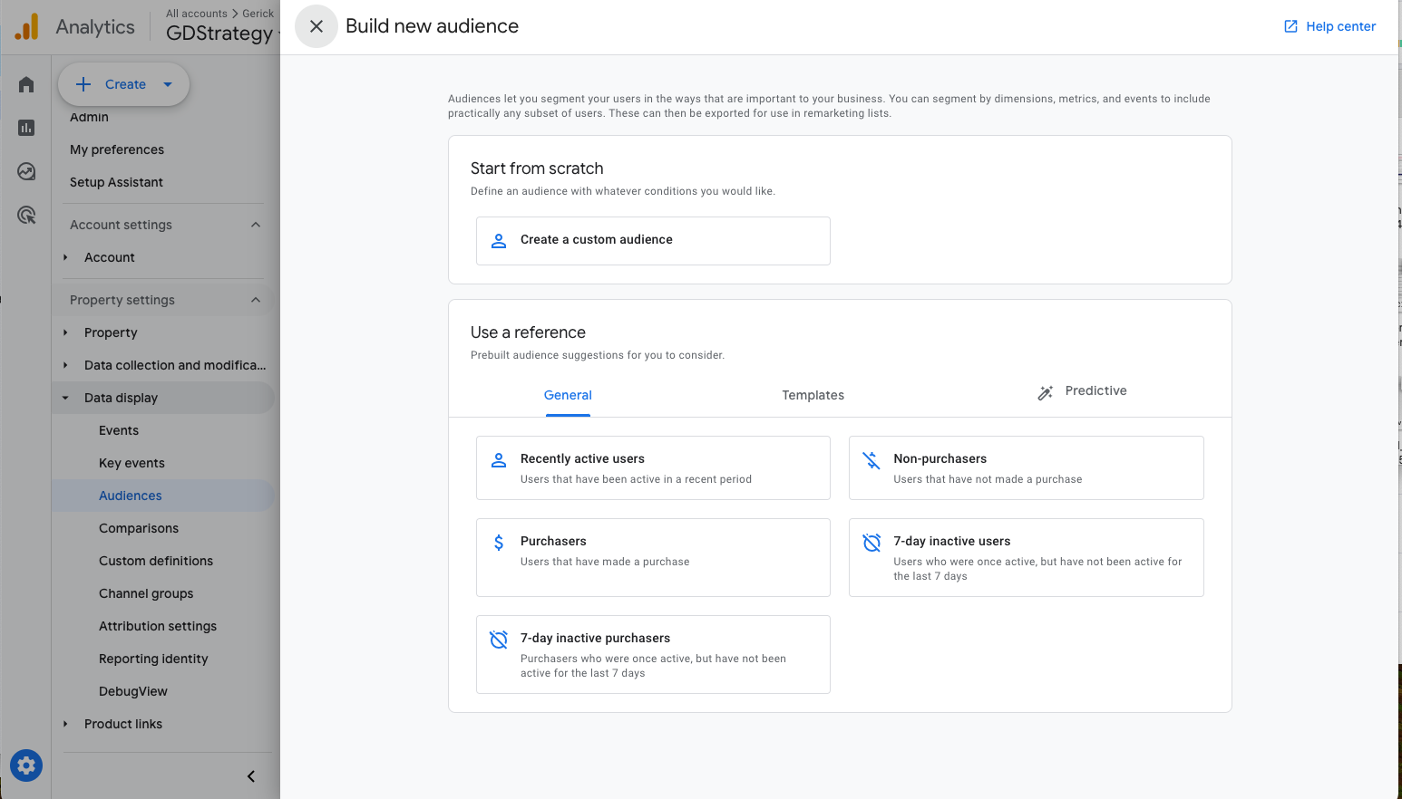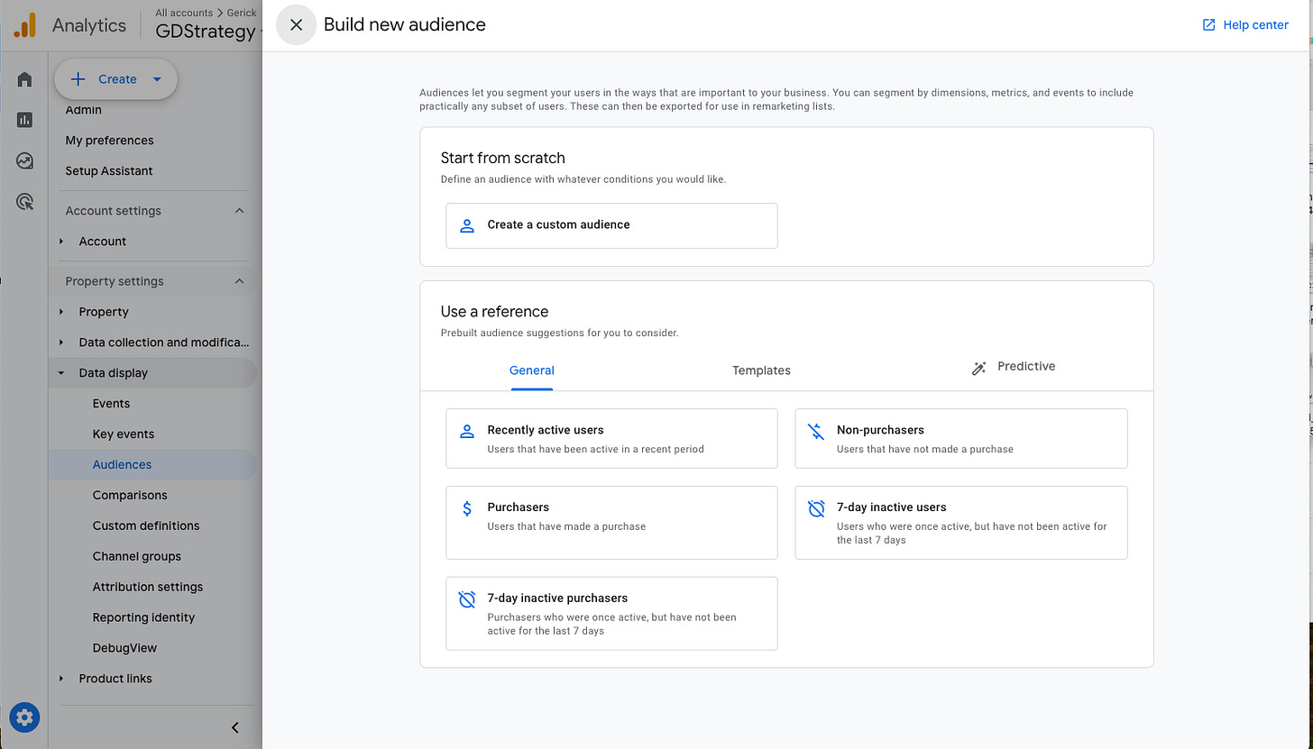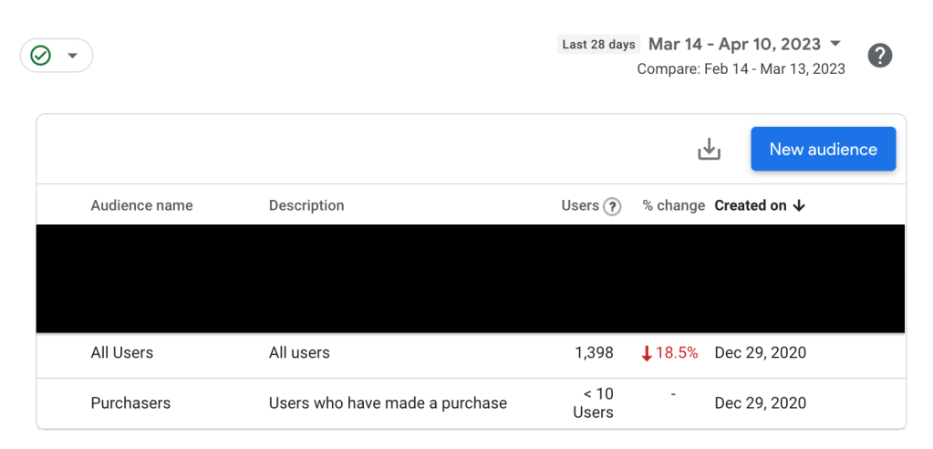 Google Analytics 4 includes two default or “predefined audiences” in each property: All users and purchasers.