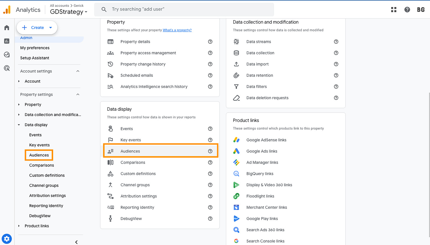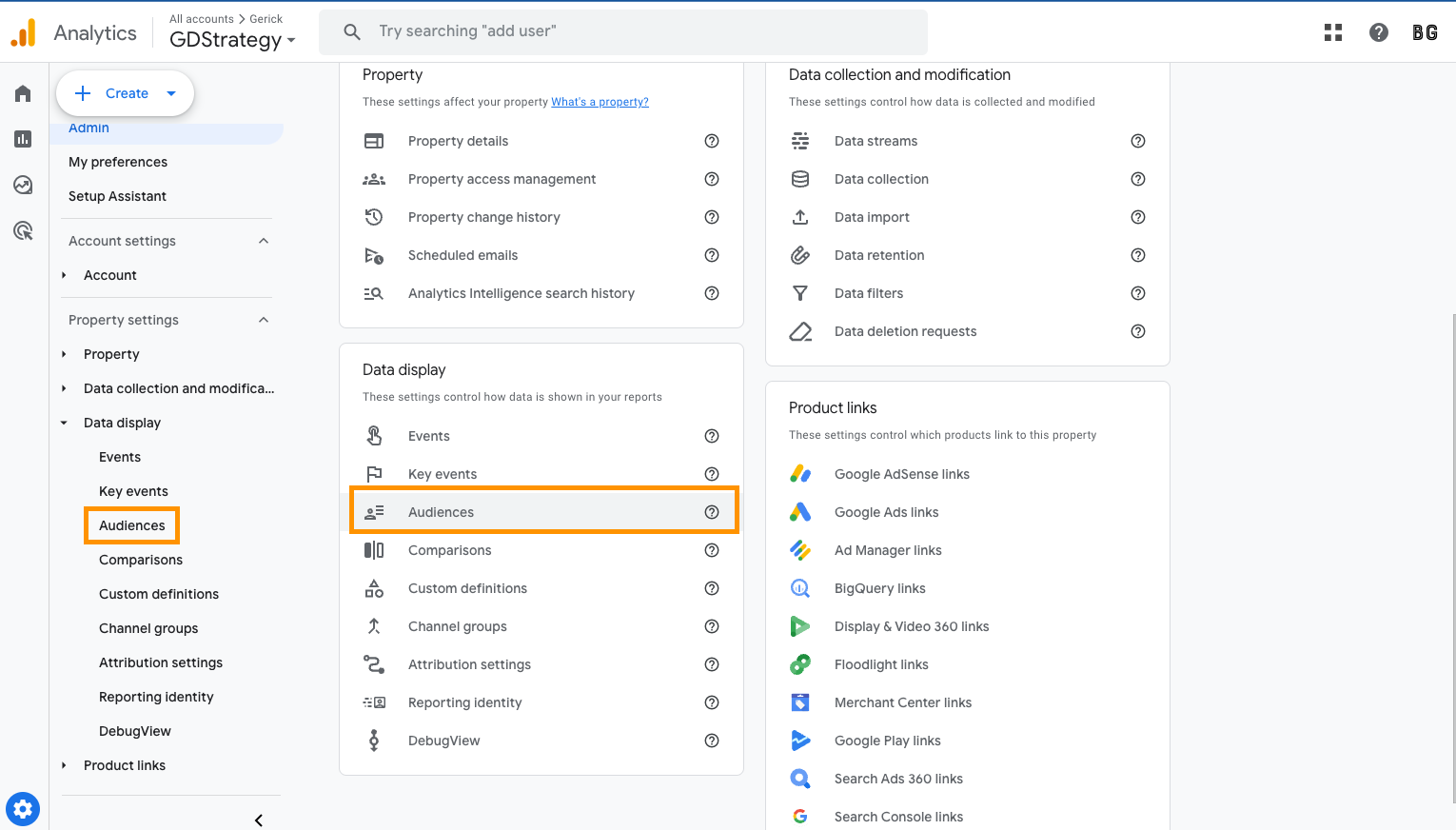 You can find your Audiences in the Admin section of GA4. The links in the screenshot below both go to the same place.