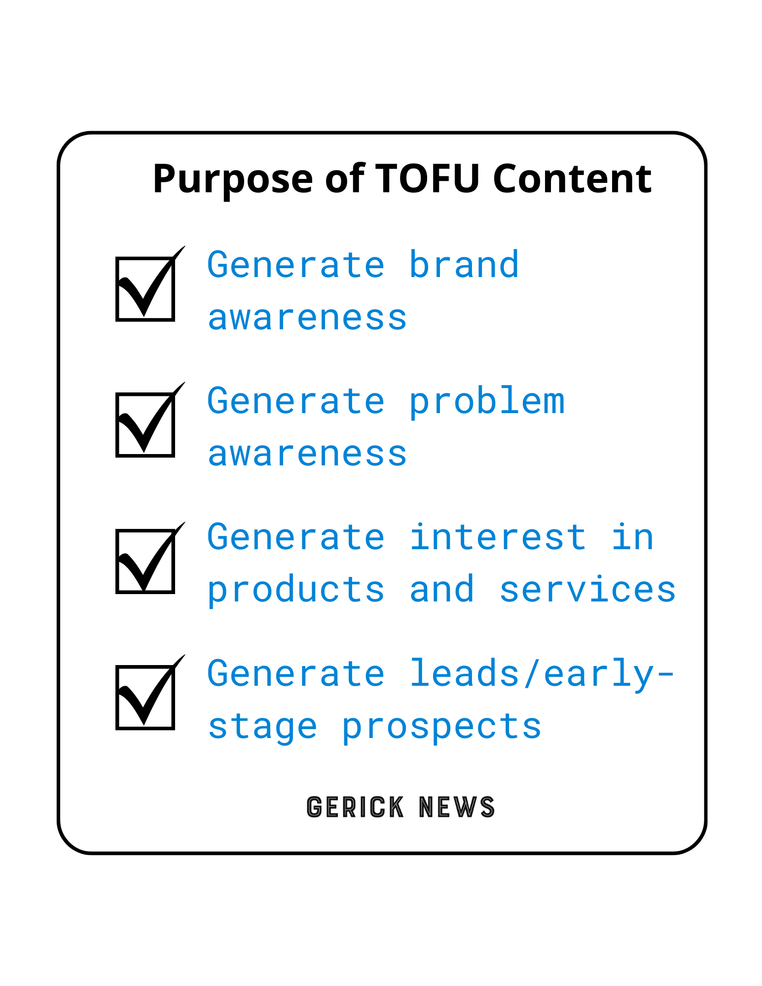 There are many formats you can use for TOFU content. Whichever one you choose, keep the four core purposes in mind. Here are some of the more popular ways to get started, and some notes on each: